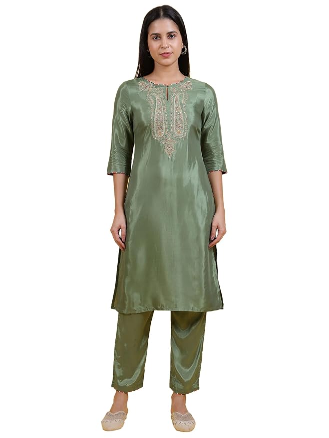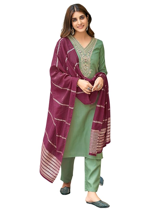 Women's Cotton Blend Sequence Embroidery Work Straight Kurta with Pant and Dupatta Set