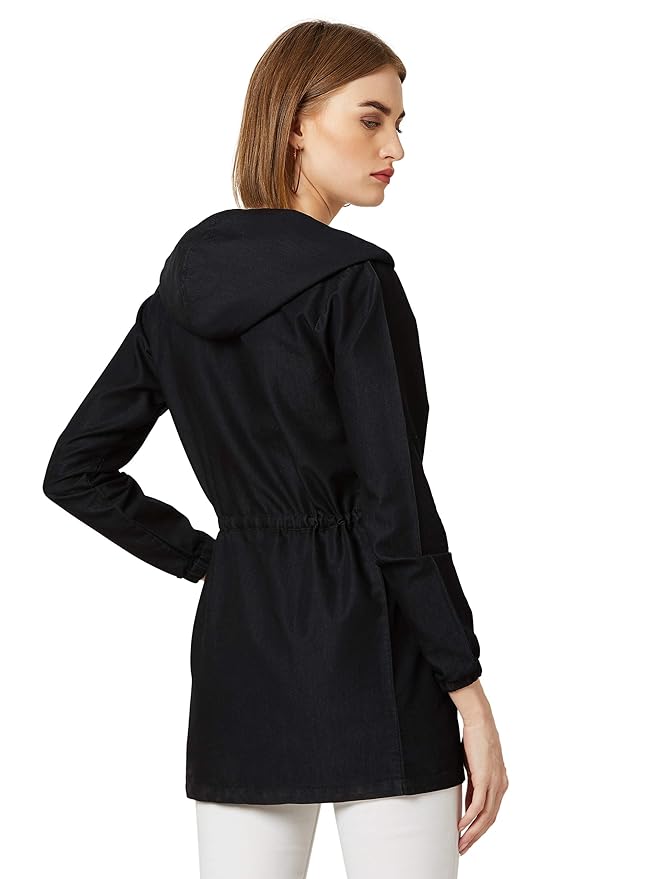 Women's Black Hooded Full Sleeves Solid Tie-Up Detailing Long Denim Jacket